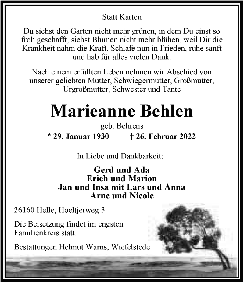 Hier finden Sie alle Traueranzeigen aus der Zeitung, die bisher für Marieanne Behlen erschienen sind. Weitere Traueranzeigen, die in der Zeitung erscheinen, werden hier ebenfalls aufgelistet