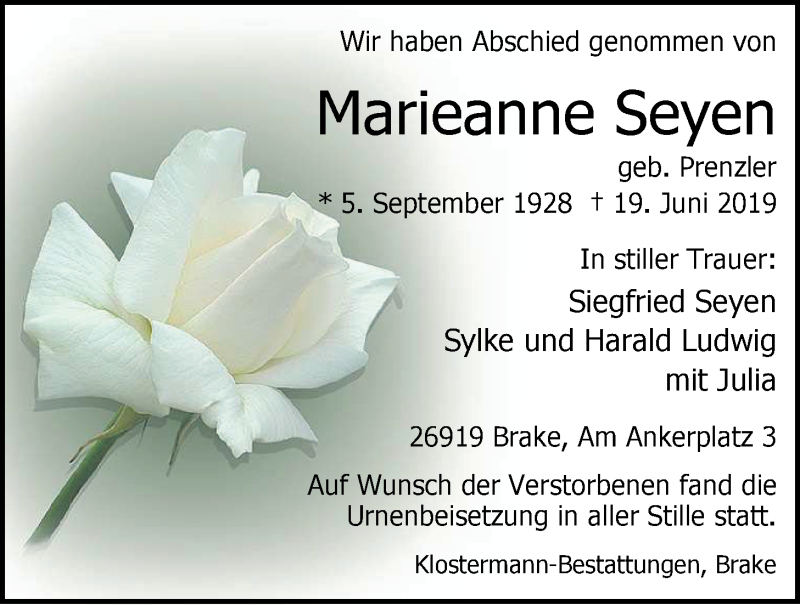 Hier finden Sie alle Traueranzeigen aus der Zeitung, die bisher für Marieanne Seyen erschienen sind. Weitere Traueranzeigen, die in der Zeitung erscheinen, werden hier ebenfalls aufgelistet