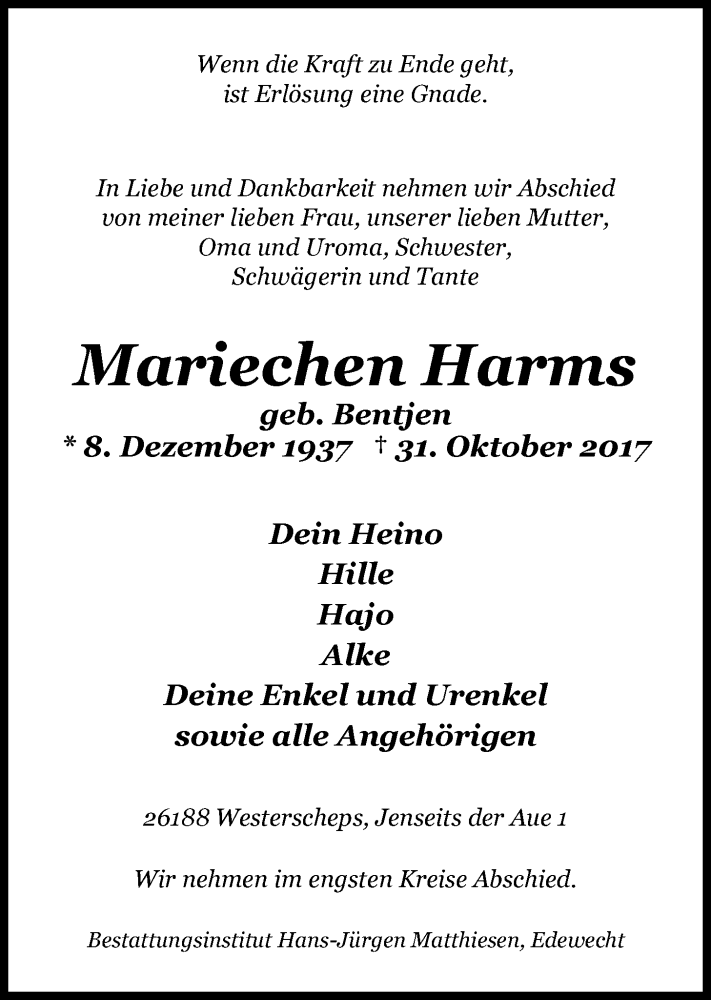 Hier finden Sie alle Traueranzeigen aus der Zeitung, die bisher für Mariechen Harms erschienen sind. Weitere Traueranzeigen, die in der Zeitung erscheinen, werden hier ebenfalls aufgelistet