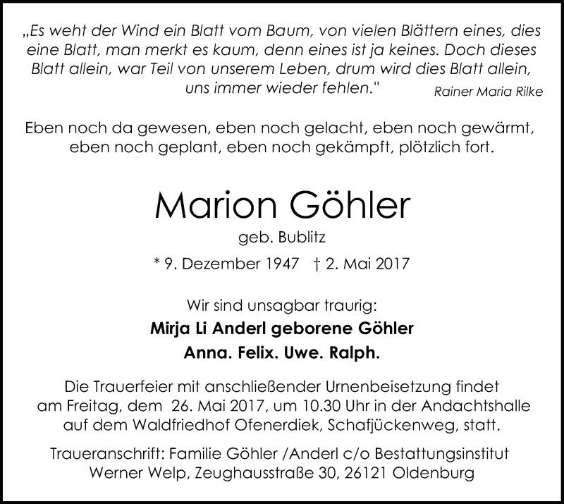 Hier finden Sie alle Traueranzeigen aus der Zeitung, die bisher für Marion Göhler erschienen sind. Weitere Traueranzeigen, die in der Zeitung erscheinen, werden hier ebenfalls aufgelistet