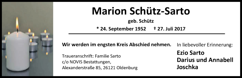 Hier finden Sie alle Traueranzeigen aus der Zeitung, die bisher für Marion Schütz-Sarto erschienen sind. Weitere Traueranzeigen, die in der Zeitung erscheinen, werden hier ebenfalls aufgelistet