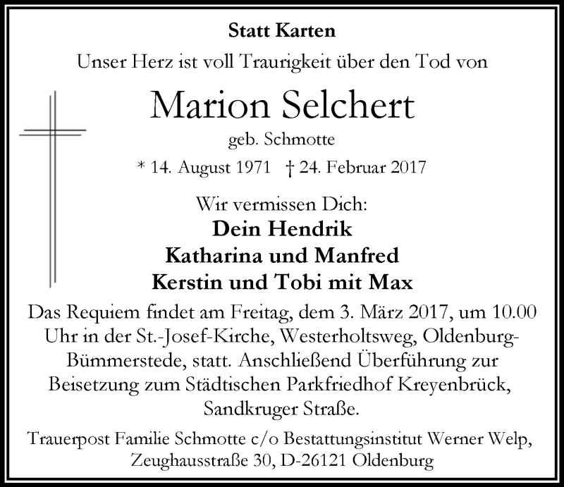 Hier finden Sie alle Traueranzeigen aus der Zeitung, die bisher für Marion Selchert erschienen sind. Weitere Traueranzeigen, die in der Zeitung erscheinen, werden hier ebenfalls aufgelistet