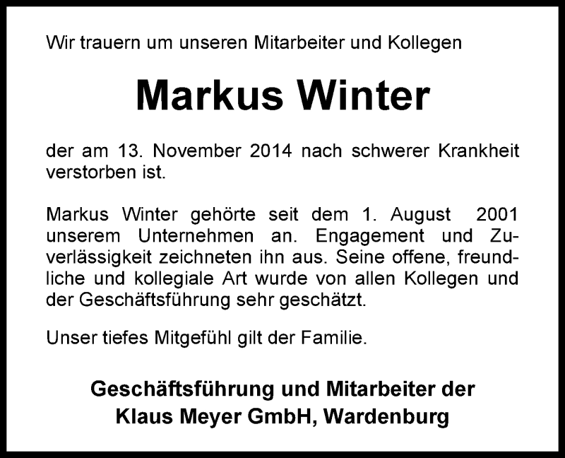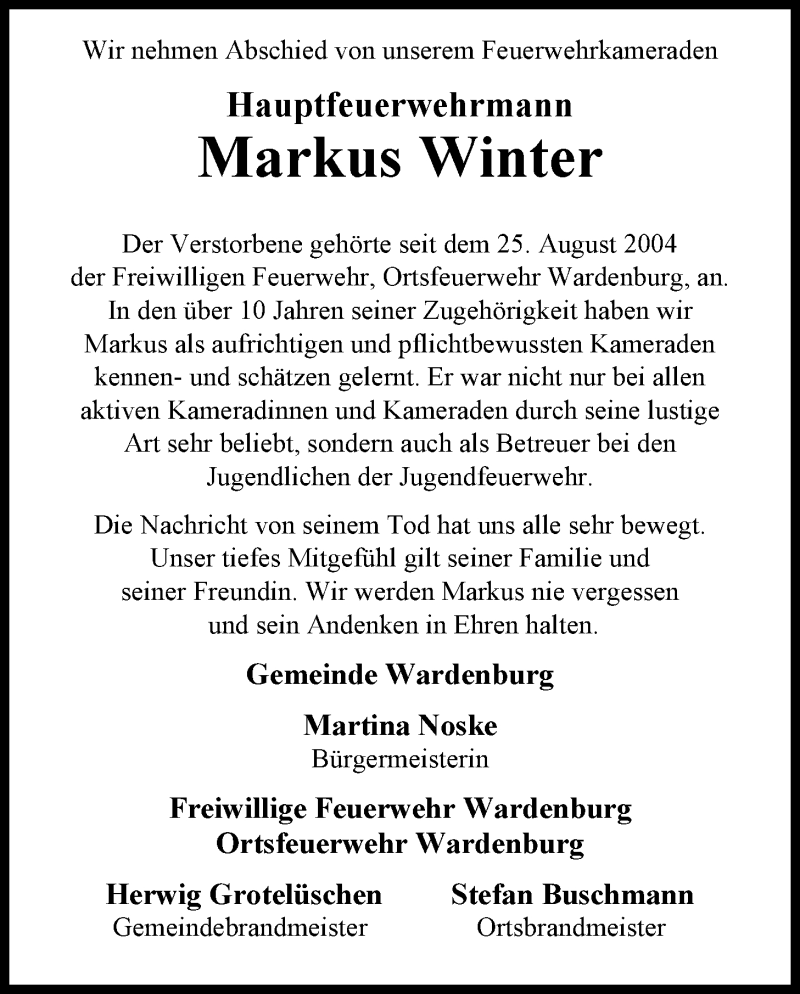 Hier finden Sie alle Traueranzeigen aus der Zeitung, die bisher für Markus Winter erschienen sind. Weitere Traueranzeigen, die in der Zeitung erscheinen, werden hier ebenfalls aufgelistet