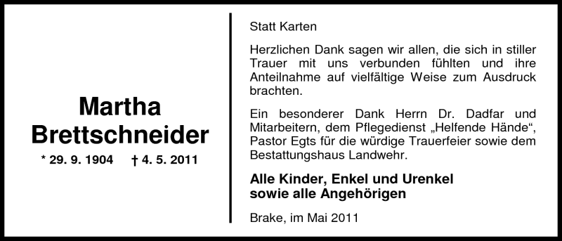 Hier finden Sie alle Traueranzeigen aus der Zeitung, die bisher für Martha Brettschneider erschienen sind. Weitere Traueranzeigen, die in der Zeitung erscheinen, werden hier ebenfalls aufgelistet