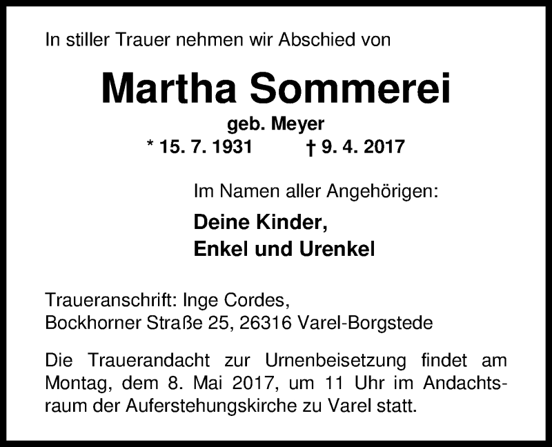 Hier finden Sie alle Traueranzeigen aus der Zeitung, die bisher für Martha Sommerei erschienen sind. Weitere Traueranzeigen, die in der Zeitung erscheinen, werden hier ebenfalls aufgelistet