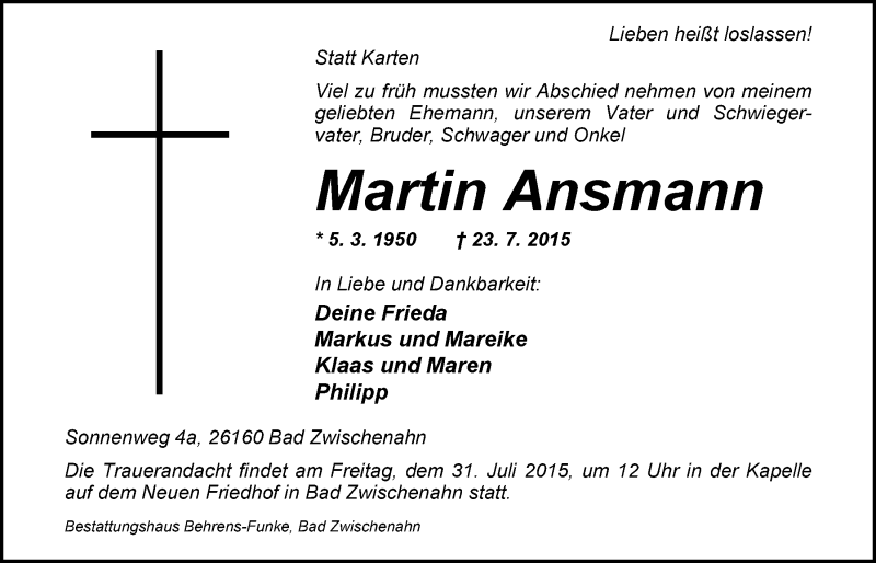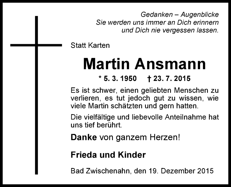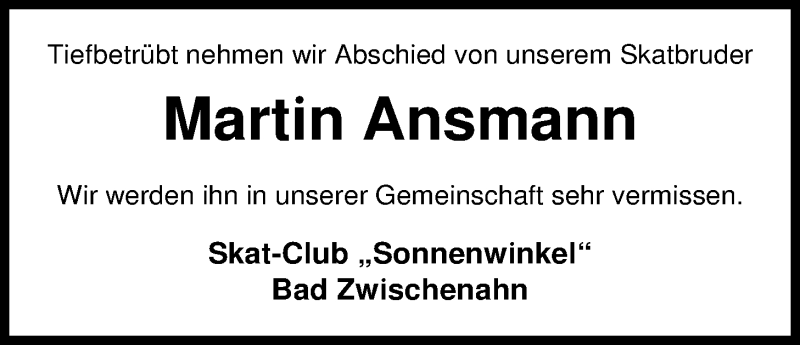 Hier finden Sie alle Traueranzeigen aus der Zeitung, die bisher für Martin Ansmann erschienen sind. Weitere Traueranzeigen, die in der Zeitung erscheinen, werden hier ebenfalls aufgelistet