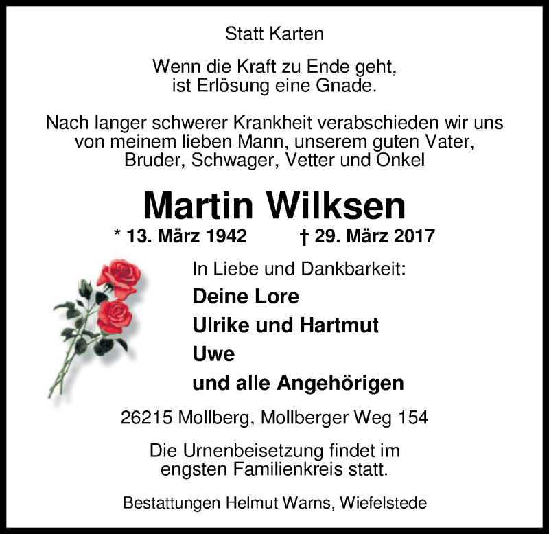 Hier finden Sie alle Traueranzeigen aus der Zeitung, die bisher für Martin Wilksen erschienen sind. Weitere Traueranzeigen, die in der Zeitung erscheinen, werden hier ebenfalls aufgelistet