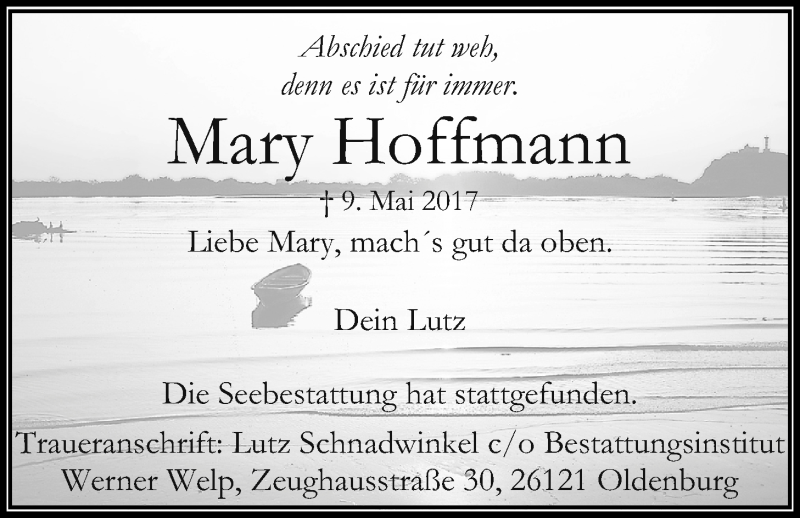 Hier finden Sie alle Traueranzeigen aus der Zeitung, die bisher für Mary Hoffmann erschienen sind. Weitere Traueranzeigen, die in der Zeitung erscheinen, werden hier ebenfalls aufgelistet