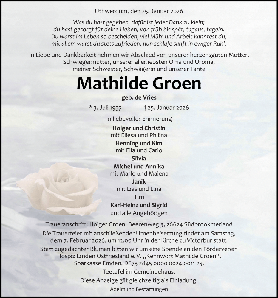 Hier finden Sie alle Traueranzeigen aus der Zeitung, die bisher für Mathilde Groen erschienen sind. Weitere Traueranzeigen, die in der Zeitung erscheinen, werden hier ebenfalls aufgelistet