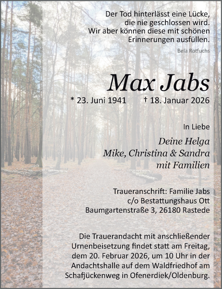 Hier finden Sie alle Traueranzeigen aus der Zeitung, die bisher für Max Jabs erschienen sind. Weitere Traueranzeigen, die in der Zeitung erscheinen, werden hier ebenfalls aufgelistet