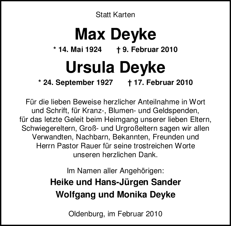 Hier finden Sie alle Traueranzeigen aus der Zeitung, die bisher für Max Deyke erschienen sind. Weitere Traueranzeigen, die in der Zeitung erscheinen, werden hier ebenfalls aufgelistet