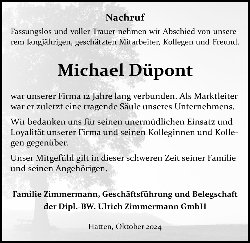 Hier finden Sie alle Traueranzeigen aus der Zeitung, die bisher für Michael Düpont erschienen sind. Weitere Traueranzeigen, die in der Zeitung erscheinen, werden hier ebenfalls aufgelistet