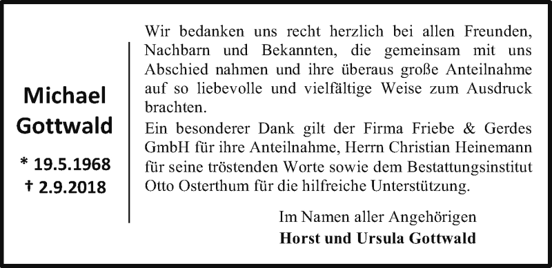 Hier finden Sie alle Traueranzeigen aus der Zeitung, die bisher für Michael Gottwald erschienen sind. Weitere Traueranzeigen, die in der Zeitung erscheinen, werden hier ebenfalls aufgelistet