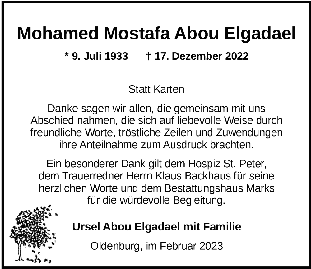 Hier finden Sie alle Traueranzeigen aus der Zeitung, die bisher für Mohamed Mostafa Abou Elgadael erschienen sind. Weitere Traueranzeigen, die in der Zeitung erscheinen, werden hier ebenfalls aufgelistet