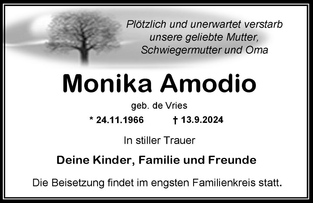 Hier finden Sie alle Traueranzeigen aus der Zeitung, die bisher für Monika Amodio erschienen sind. Weitere Traueranzeigen, die in der Zeitung erscheinen, werden hier ebenfalls aufgelistet
