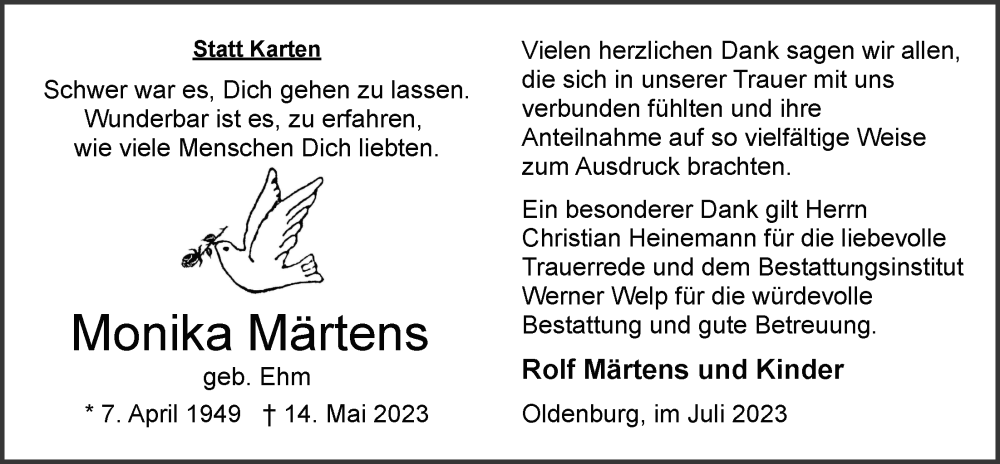 Hier finden Sie alle Traueranzeigen aus der Zeitung, die bisher für Monika Märtens erschienen sind. Weitere Traueranzeigen, die in der Zeitung erscheinen, werden hier ebenfalls aufgelistet