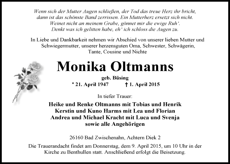 Hier finden Sie alle Traueranzeigen aus der Zeitung, die bisher für Monika Oltmanns erschienen sind. Weitere Traueranzeigen, die in der Zeitung erscheinen, werden hier ebenfalls aufgelistet