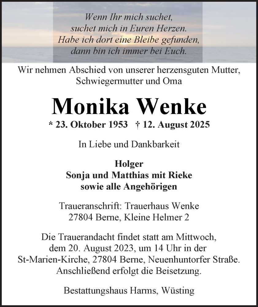 Hier finden Sie alle Traueranzeigen aus der Zeitung, die bisher für Monika Wenke erschienen sind. Weitere Traueranzeigen, die in der Zeitung erscheinen, werden hier ebenfalls aufgelistet