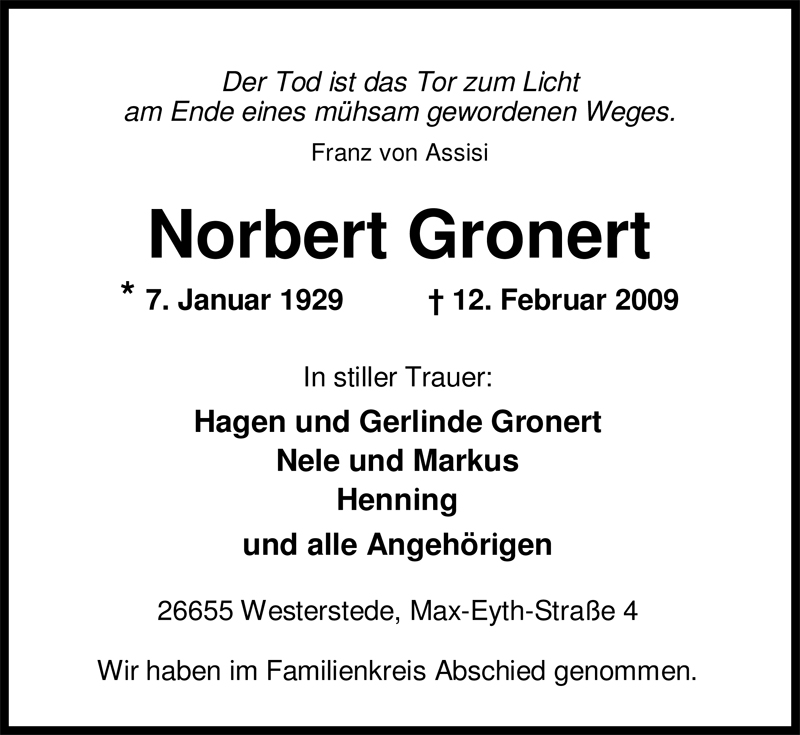 Hier finden Sie alle Traueranzeigen aus der Zeitung, die bisher für Norbert Gronert erschienen sind. Weitere Traueranzeigen, die in der Zeitung erscheinen, werden hier ebenfalls aufgelistet
