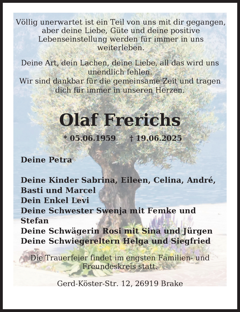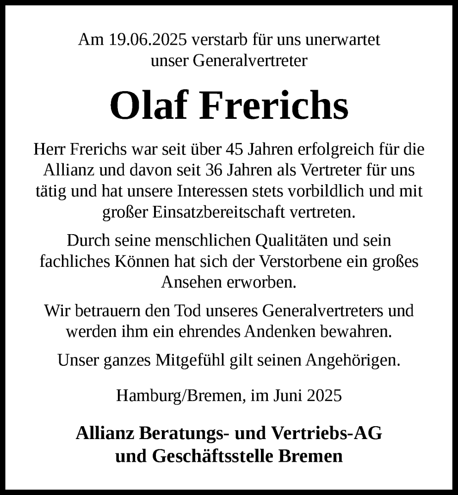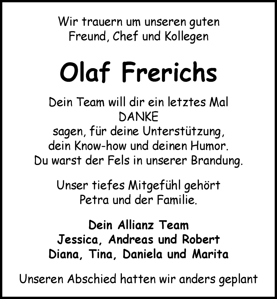 Hier finden Sie alle Traueranzeigen aus der Zeitung, die bisher für Olaf Frerichs erschienen sind. Weitere Traueranzeigen, die in der Zeitung erscheinen, werden hier ebenfalls aufgelistet