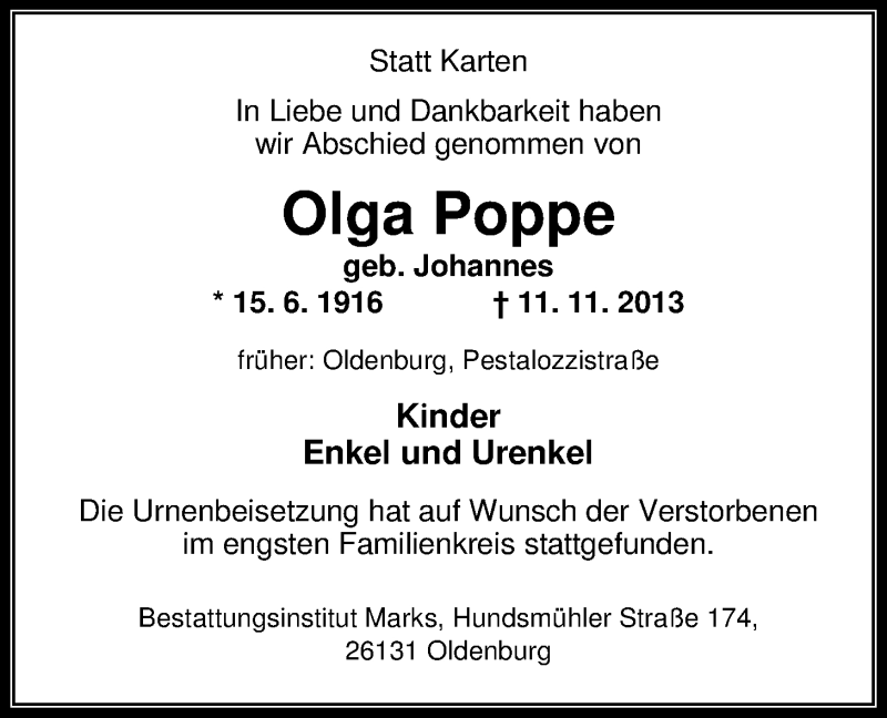 Hier finden Sie alle Traueranzeigen aus der Zeitung, die bisher für Olga Poppe erschienen sind. Weitere Traueranzeigen, die in der Zeitung erscheinen, werden hier ebenfalls aufgelistet