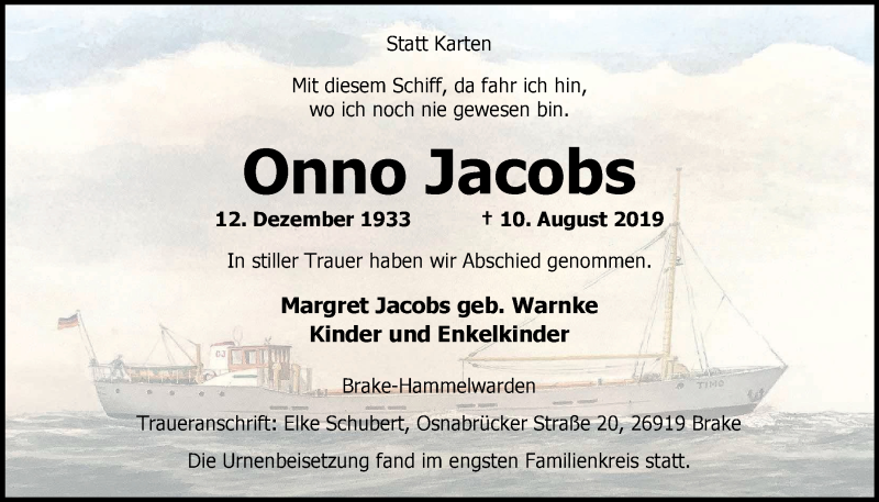 Hier finden Sie alle Traueranzeigen aus der Zeitung, die bisher für Onno Jacobs erschienen sind. Weitere Traueranzeigen, die in der Zeitung erscheinen, werden hier ebenfalls aufgelistet