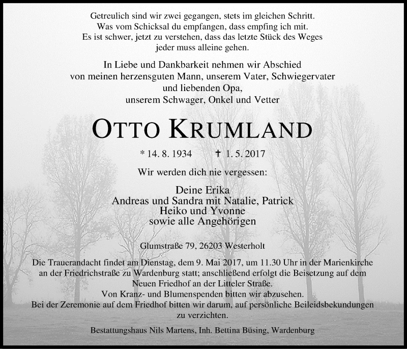 Hier finden Sie alle Traueranzeigen aus der Zeitung, die bisher für Otto Krumland erschienen sind. Weitere Traueranzeigen, die in der Zeitung erscheinen, werden hier ebenfalls aufgelistet