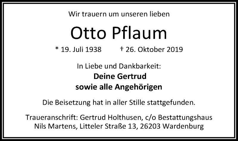 Hier finden Sie alle Traueranzeigen aus der Zeitung, die bisher für Otto Pflaum erschienen sind. Weitere Traueranzeigen, die in der Zeitung erscheinen, werden hier ebenfalls aufgelistet