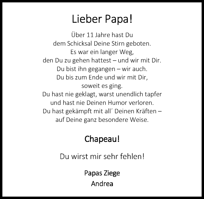 Hier finden Sie alle Traueranzeigen aus der Zeitung, die bisher für Papa erschienen sind. Weitere Traueranzeigen, die in der Zeitung erscheinen, werden hier ebenfalls aufgelistet