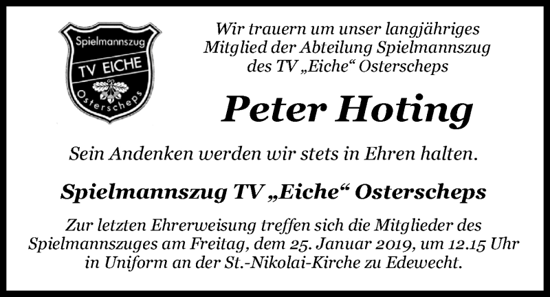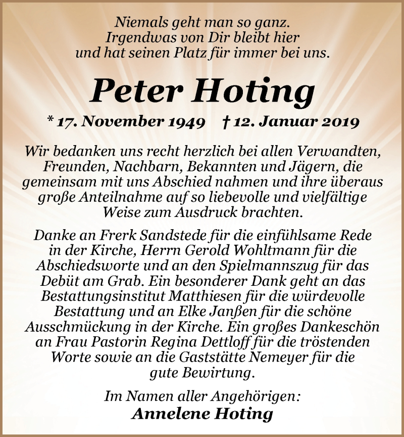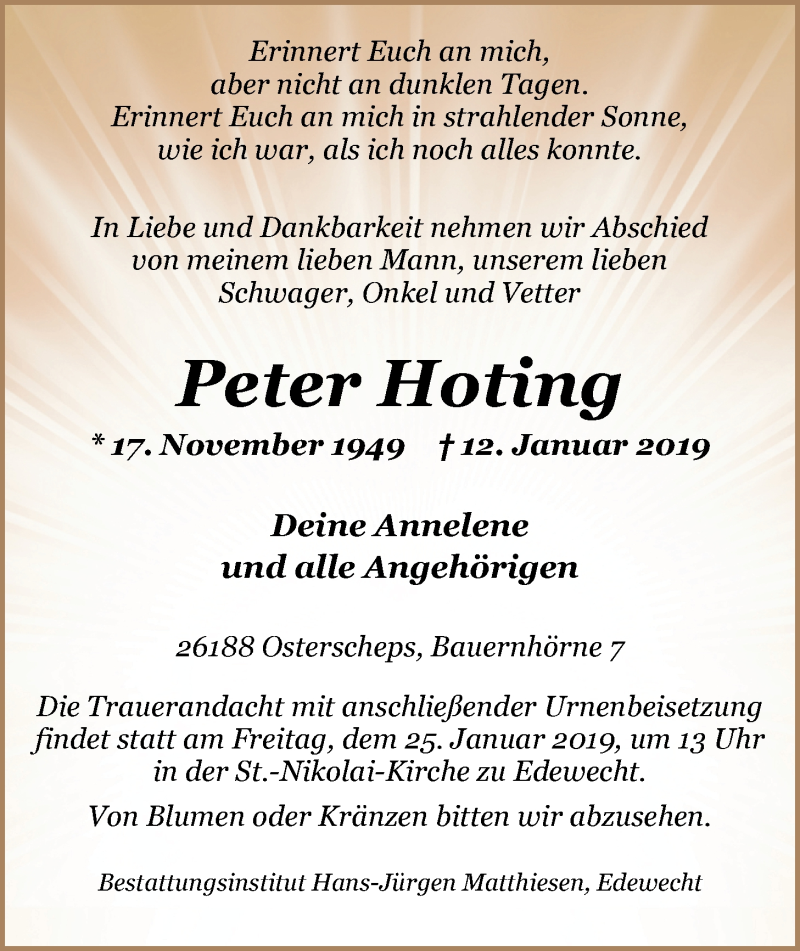 Hier finden Sie alle Traueranzeigen aus der Zeitung, die bisher für Peter Hoting erschienen sind. Weitere Traueranzeigen, die in der Zeitung erscheinen, werden hier ebenfalls aufgelistet