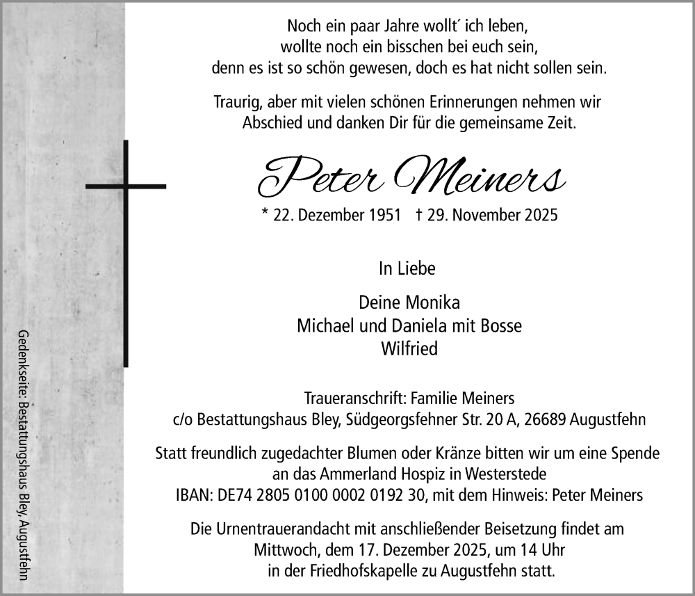 Hier finden Sie alle Traueranzeigen aus der Zeitung, die bisher für Peter Meiners erschienen sind. Weitere Traueranzeigen, die in der Zeitung erscheinen, werden hier ebenfalls aufgelistet