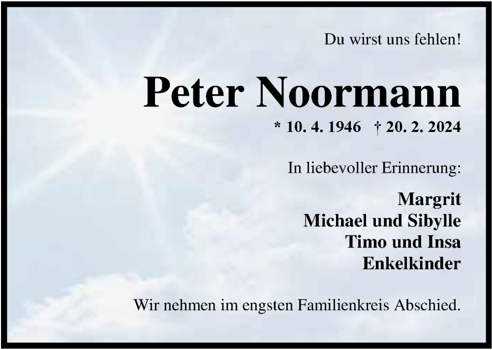 Hier finden Sie alle Traueranzeigen aus der Zeitung, die bisher für Peter Noormann erschienen sind. Weitere Traueranzeigen, die in der Zeitung erscheinen, werden hier ebenfalls aufgelistet