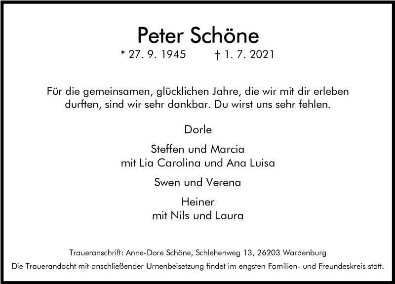 Hier finden Sie alle Traueranzeigen aus der Zeitung, die bisher für Peter Schöne erschienen sind. Weitere Traueranzeigen, die in der Zeitung erscheinen, werden hier ebenfalls aufgelistet