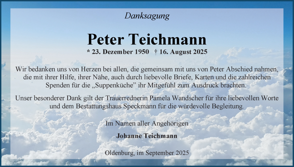 Hier finden Sie alle Traueranzeigen aus der Zeitung, die bisher für Peter Teichmann erschienen sind. Weitere Traueranzeigen, die in der Zeitung erscheinen, werden hier ebenfalls aufgelistet