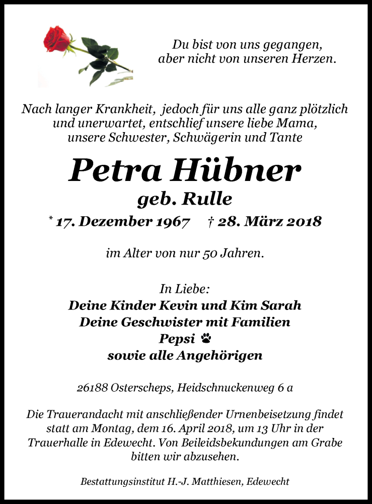 Hier finden Sie alle Traueranzeigen aus der Zeitung, die bisher für Petra Hübner erschienen sind. Weitere Traueranzeigen, die in der Zeitung erscheinen, werden hier ebenfalls aufgelistet