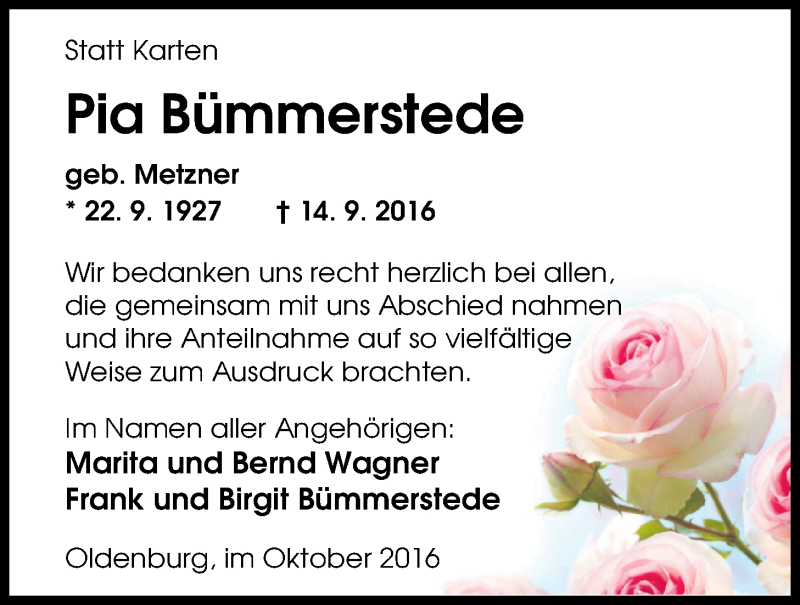 Hier finden Sie alle Traueranzeigen aus der Zeitung, die bisher für Pia Bümmerstede erschienen sind. Weitere Traueranzeigen, die in der Zeitung erscheinen, werden hier ebenfalls aufgelistet