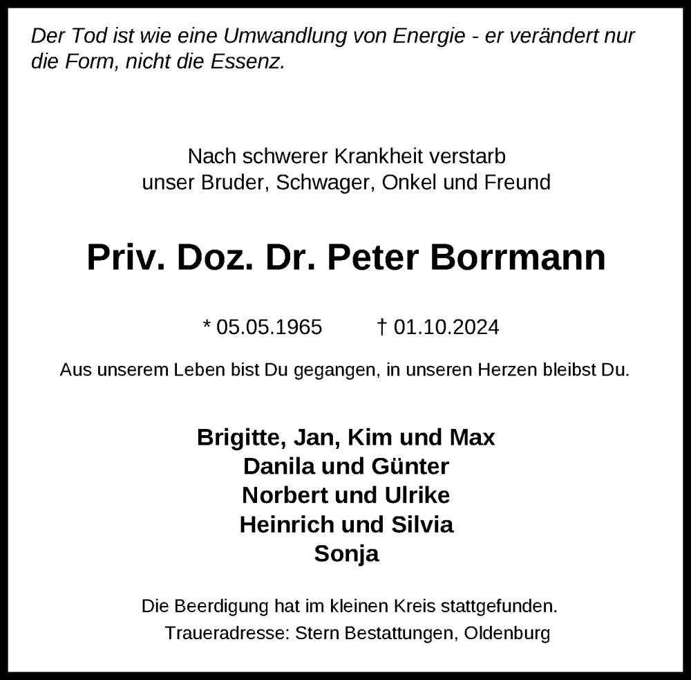Hier finden Sie alle Traueranzeigen aus der Zeitung, die bisher für Priv. Doz. Dr. Peter Borrmann erschienen sind. Weitere Traueranzeigen, die in der Zeitung erscheinen, werden hier ebenfalls aufgelistet