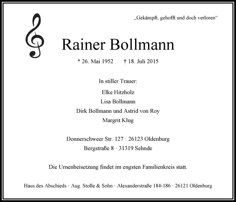 Hier finden Sie alle Traueranzeigen aus der Zeitung, die bisher für Rainer Bollmann erschienen sind. Weitere Traueranzeigen, die in der Zeitung erscheinen, werden hier ebenfalls aufgelistet