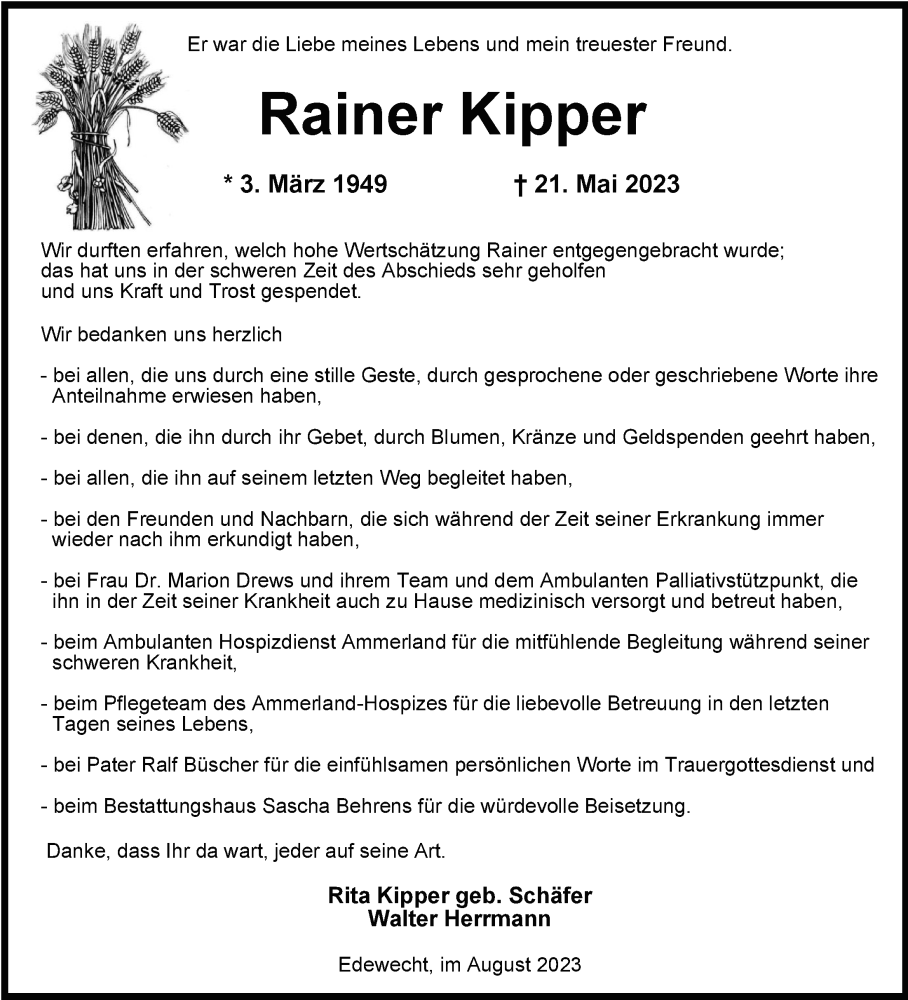 Hier finden Sie alle Traueranzeigen aus der Zeitung, die bisher für Rainer Kipper erschienen sind. Weitere Traueranzeigen, die in der Zeitung erscheinen, werden hier ebenfalls aufgelistet