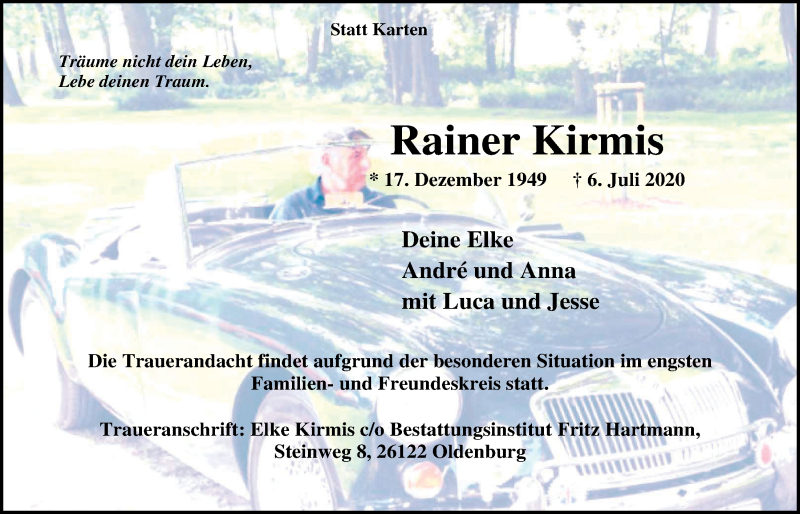 Hier finden Sie alle Traueranzeigen aus der Zeitung, die bisher für Rainer Kirmis erschienen sind. Weitere Traueranzeigen, die in der Zeitung erscheinen, werden hier ebenfalls aufgelistet