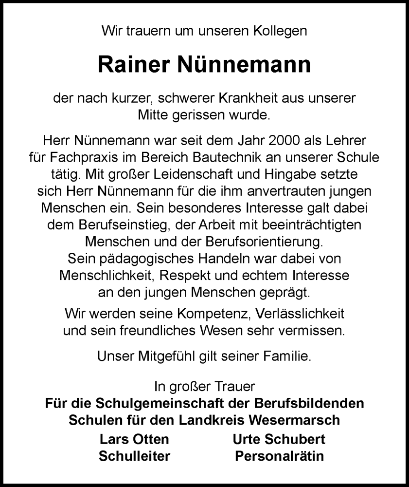 Hier finden Sie alle Traueranzeigen aus der Zeitung, die bisher für Rainer Nünnemann erschienen sind. Weitere Traueranzeigen, die in der Zeitung erscheinen, werden hier ebenfalls aufgelistet