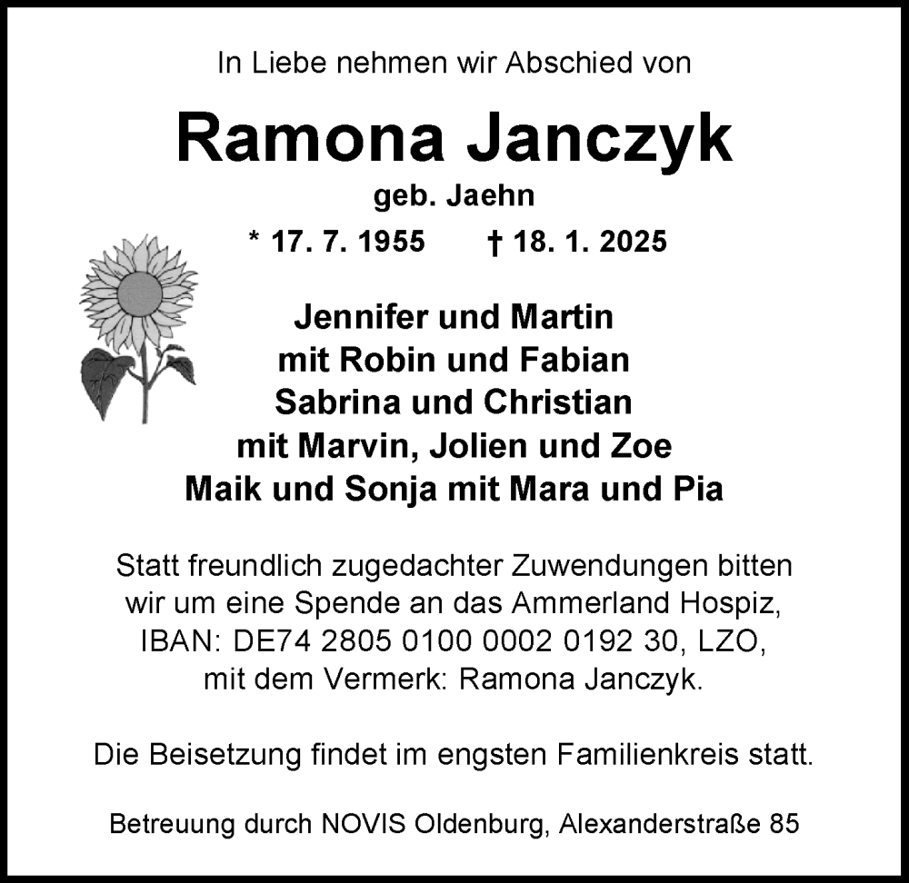 Hier finden Sie alle Traueranzeigen aus der Zeitung, die bisher für Ramona Janczyk erschienen sind. Weitere Traueranzeigen, die in der Zeitung erscheinen, werden hier ebenfalls aufgelistet