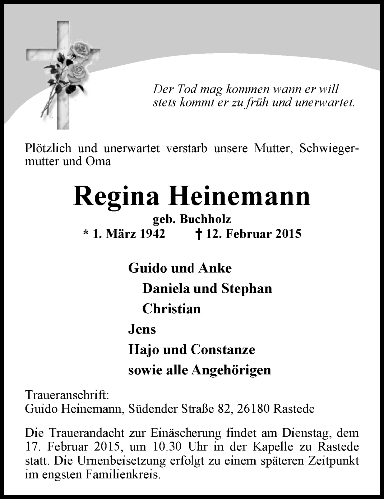 Hier finden Sie alle Traueranzeigen aus der Zeitung, die bisher für Regina Heinemann erschienen sind. Weitere Traueranzeigen, die in der Zeitung erscheinen, werden hier ebenfalls aufgelistet