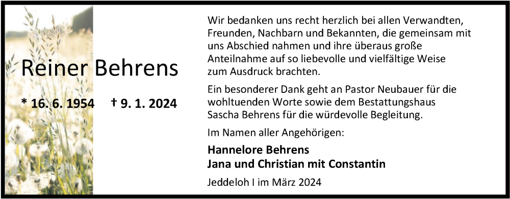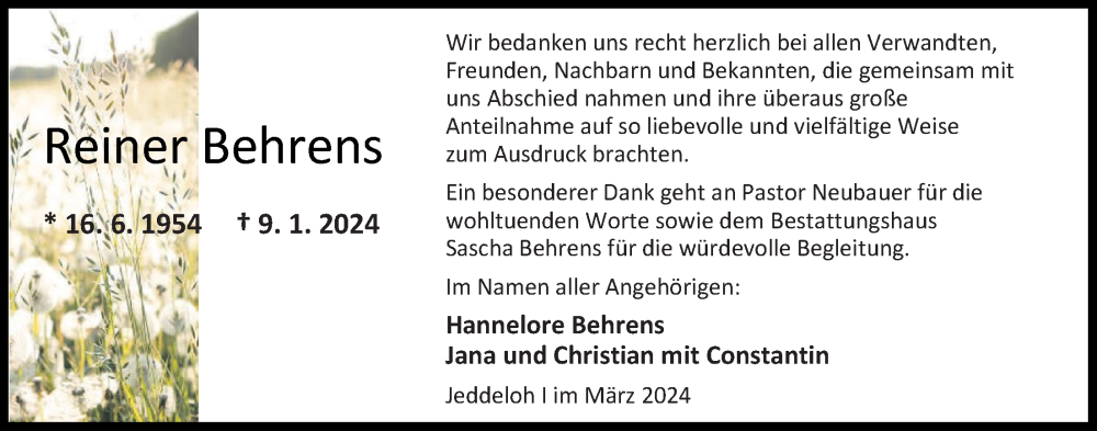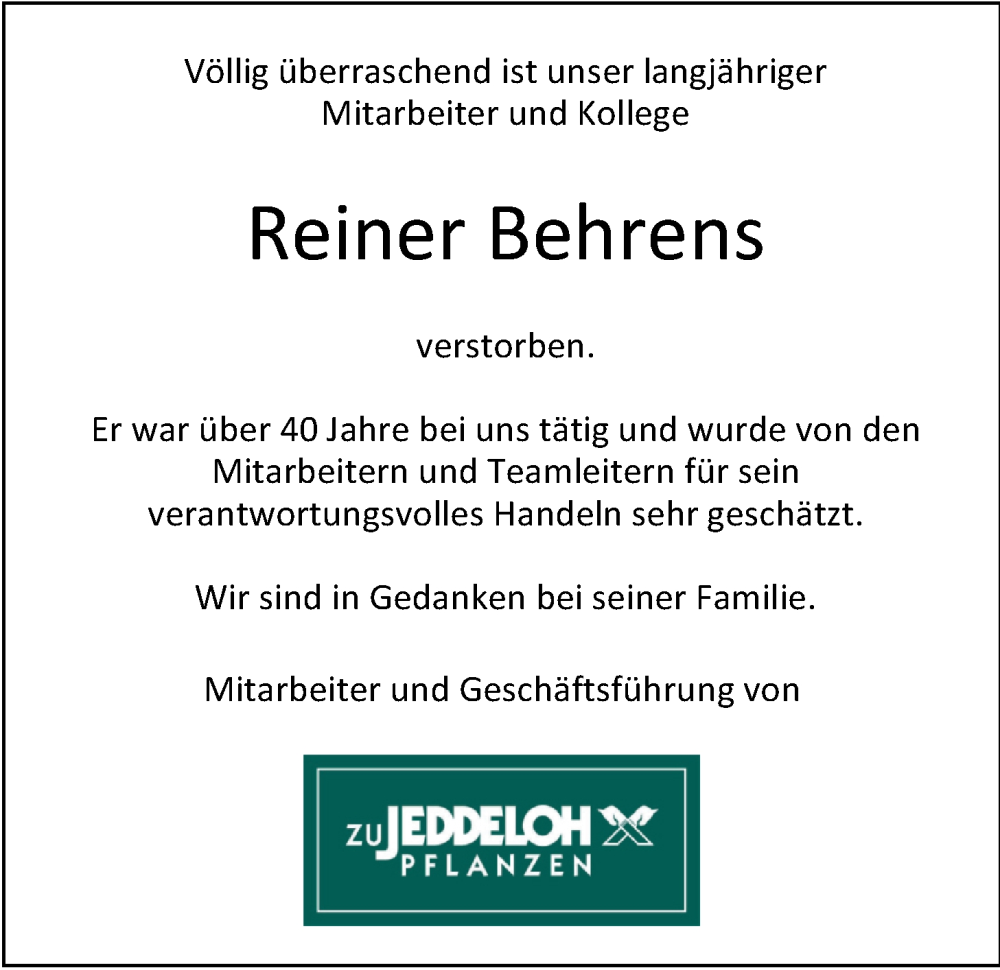 Hier finden Sie alle Traueranzeigen aus der Zeitung, die bisher für Reiner Behrens erschienen sind. Weitere Traueranzeigen, die in der Zeitung erscheinen, werden hier ebenfalls aufgelistet