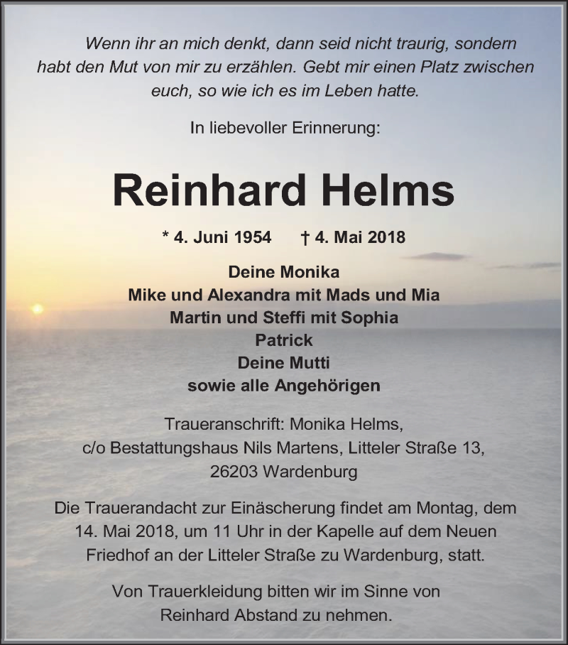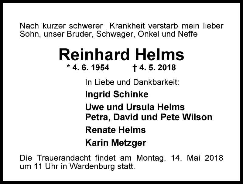 Hier finden Sie alle Traueranzeigen aus der Zeitung, die bisher für Reinhard Helms erschienen sind. Weitere Traueranzeigen, die in der Zeitung erscheinen, werden hier ebenfalls aufgelistet