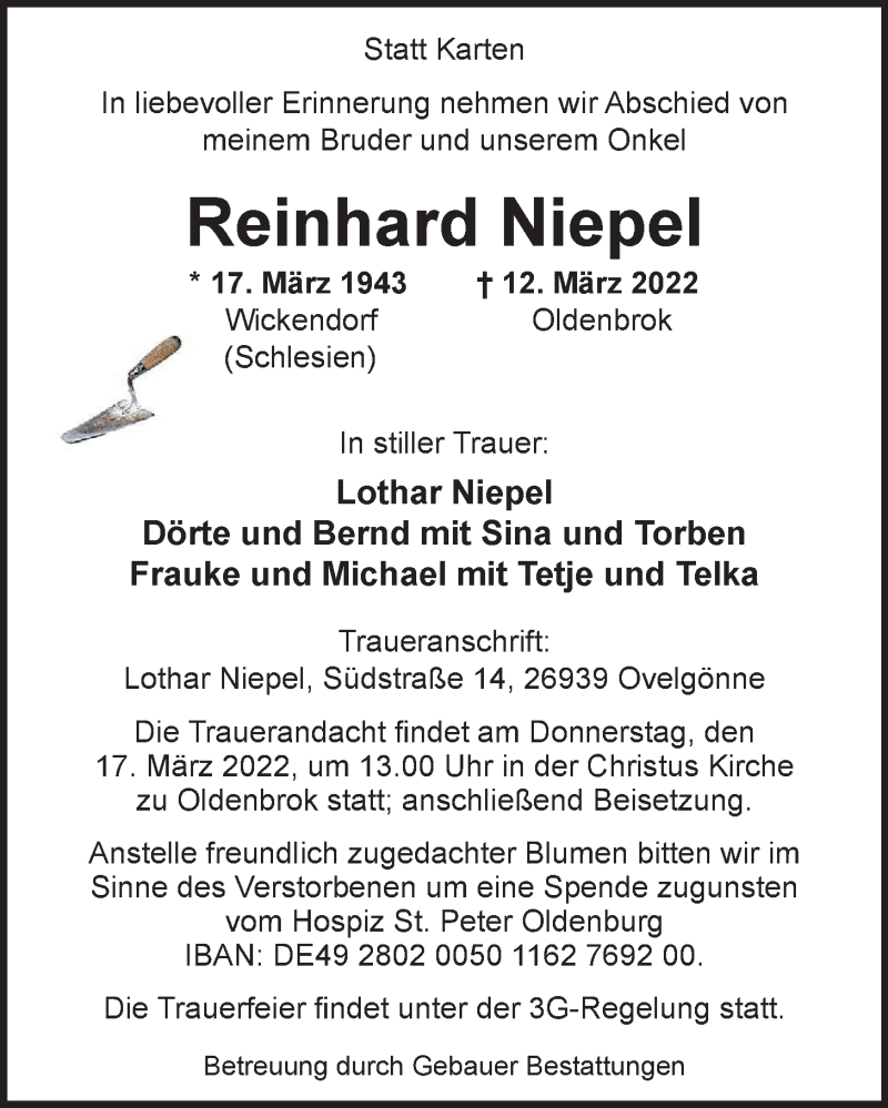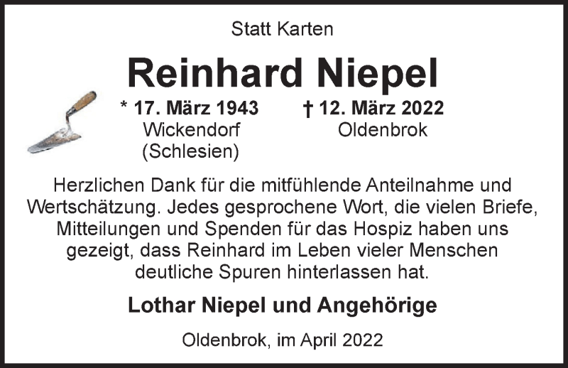 Hier finden Sie alle Traueranzeigen aus der Zeitung, die bisher für Reinhard Niepel erschienen sind. Weitere Traueranzeigen, die in der Zeitung erscheinen, werden hier ebenfalls aufgelistet