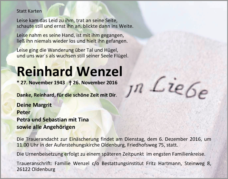 Hier finden Sie alle Traueranzeigen aus der Zeitung, die bisher für Reinhard Wenzel erschienen sind. Weitere Traueranzeigen, die in der Zeitung erscheinen, werden hier ebenfalls aufgelistet
