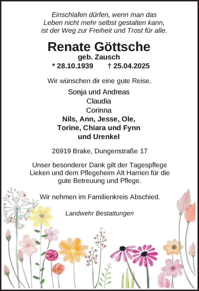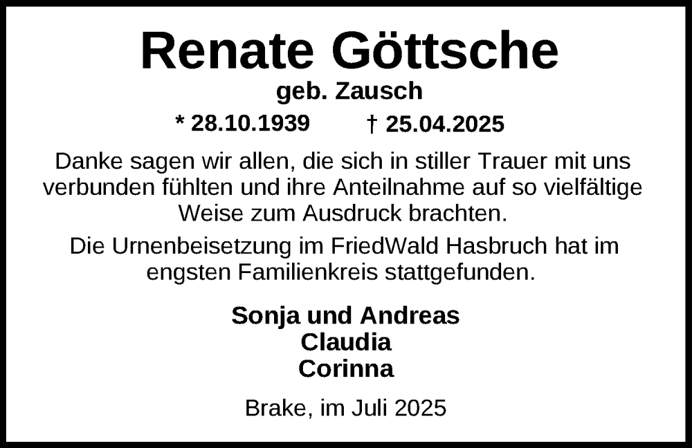 Hier finden Sie alle Traueranzeigen aus der Zeitung, die bisher für Renate Göttsche erschienen sind. Weitere Traueranzeigen, die in der Zeitung erscheinen, werden hier ebenfalls aufgelistet