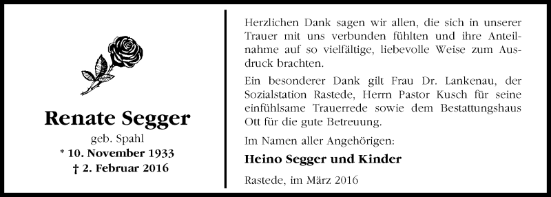 Hier finden Sie alle Traueranzeigen aus der Zeitung, die bisher für Renate Segger erschienen sind. Weitere Traueranzeigen, die in der Zeitung erscheinen, werden hier ebenfalls aufgelistet