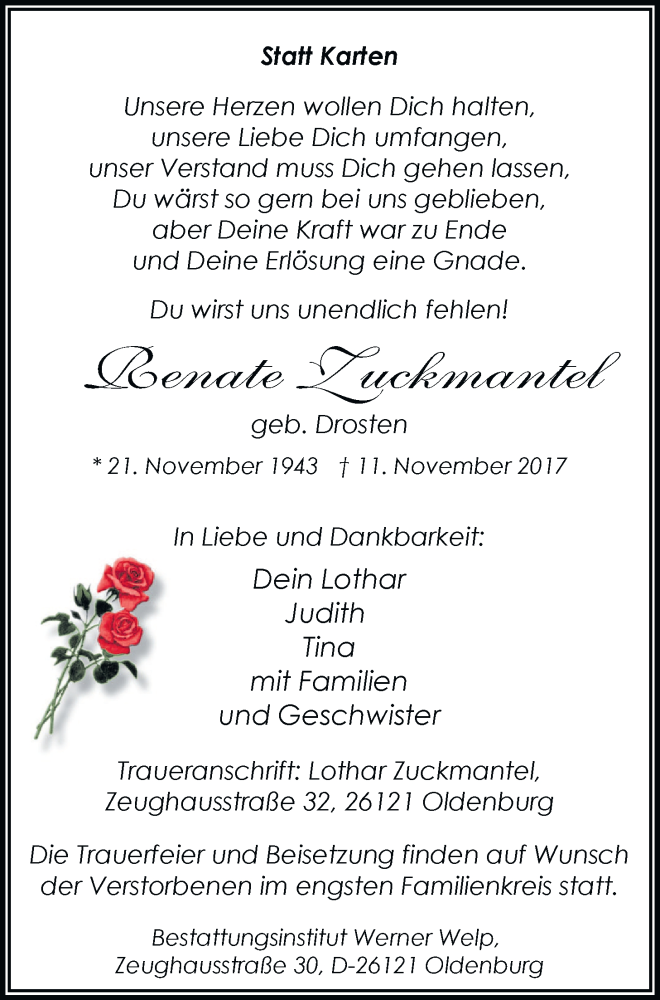 Hier finden Sie alle Traueranzeigen aus der Zeitung, die bisher für Renate Zuckmantel erschienen sind. Weitere Traueranzeigen, die in der Zeitung erscheinen, werden hier ebenfalls aufgelistet